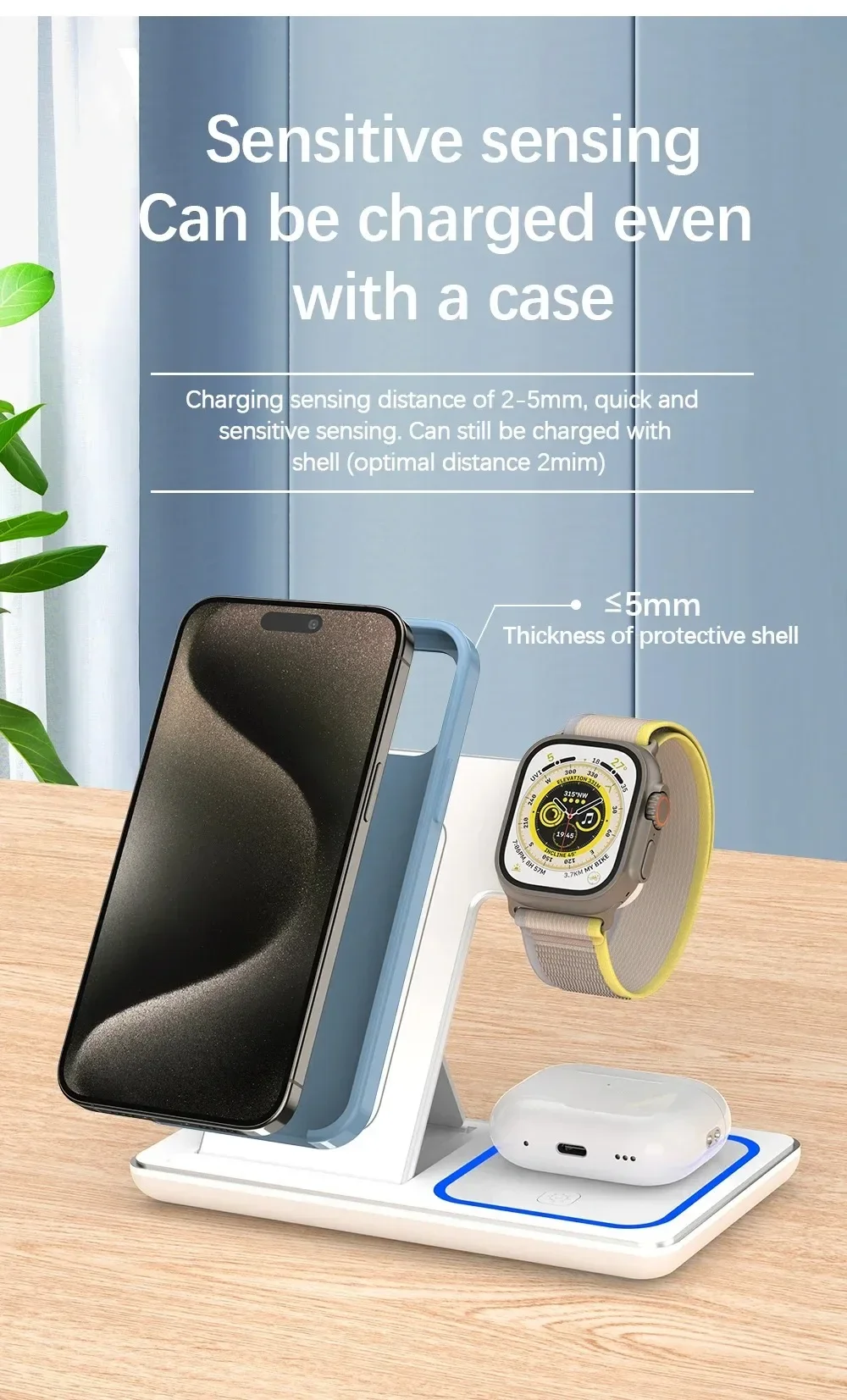 [Case Friendly & Sleep-Friendly Indicator] The wireless charger for iphone supports most phone cases not thicker than 2 inches/5 mm, so saving the trouble to remove the phone case while charging with wireless charging station (not including cases with magnetic or metal attachments). Place the devices on wireless phone charger to start charging, and the Blue light will be on and turn off automatically after 20s. So you will not worry about the light affecting your sleep.