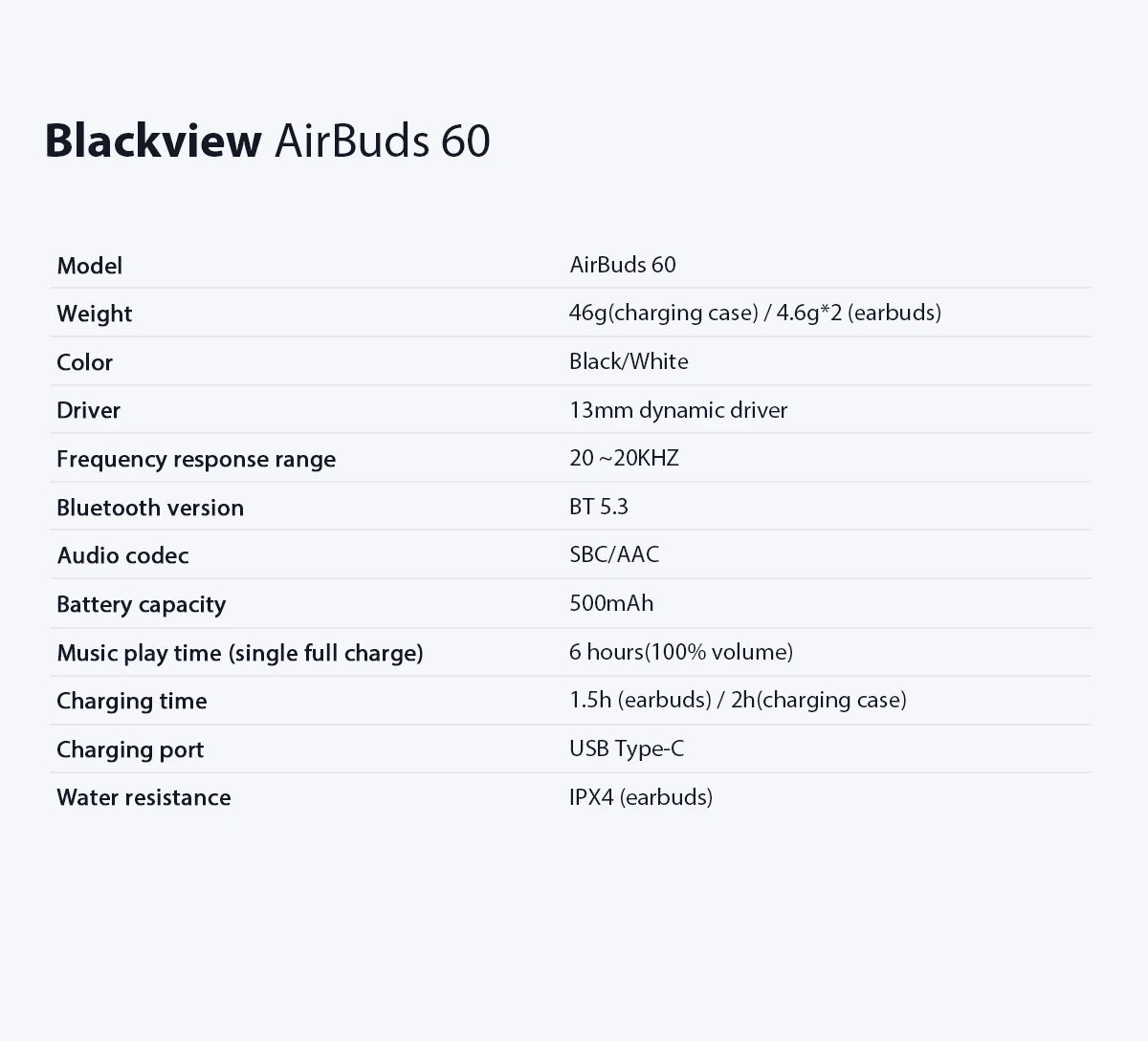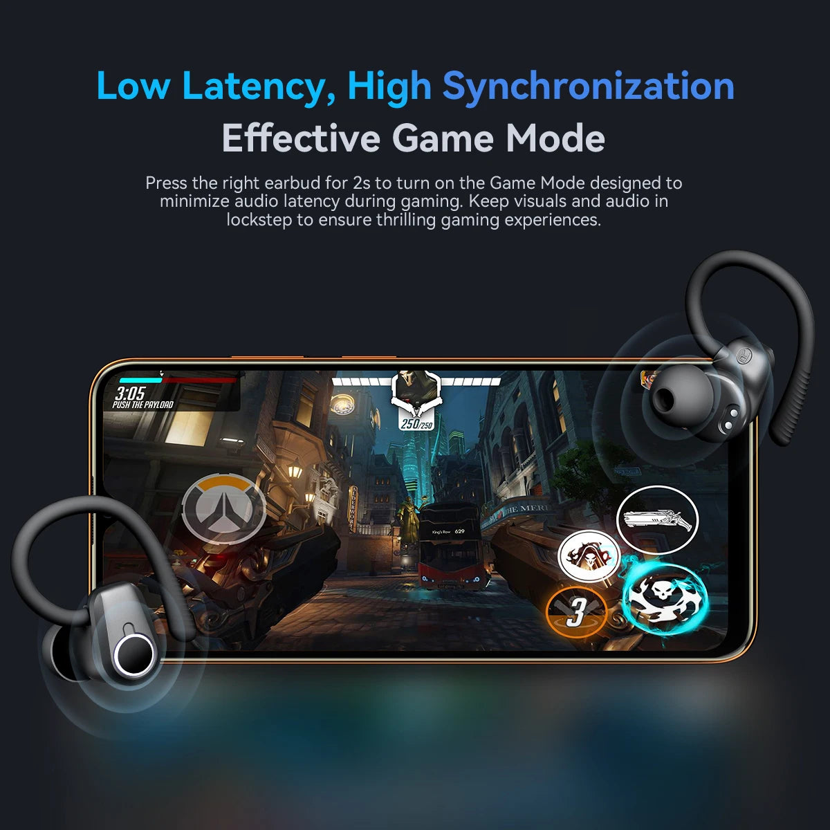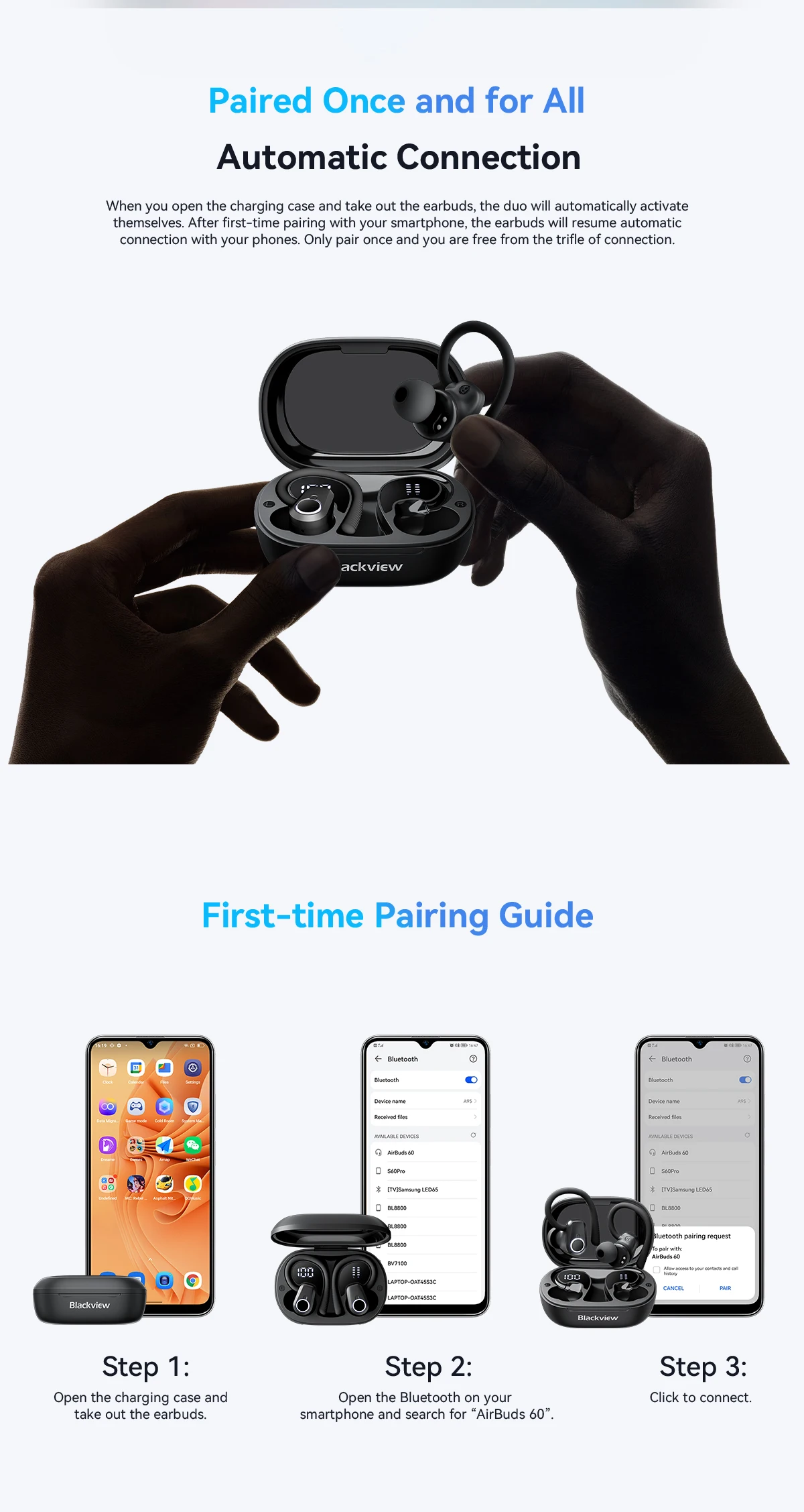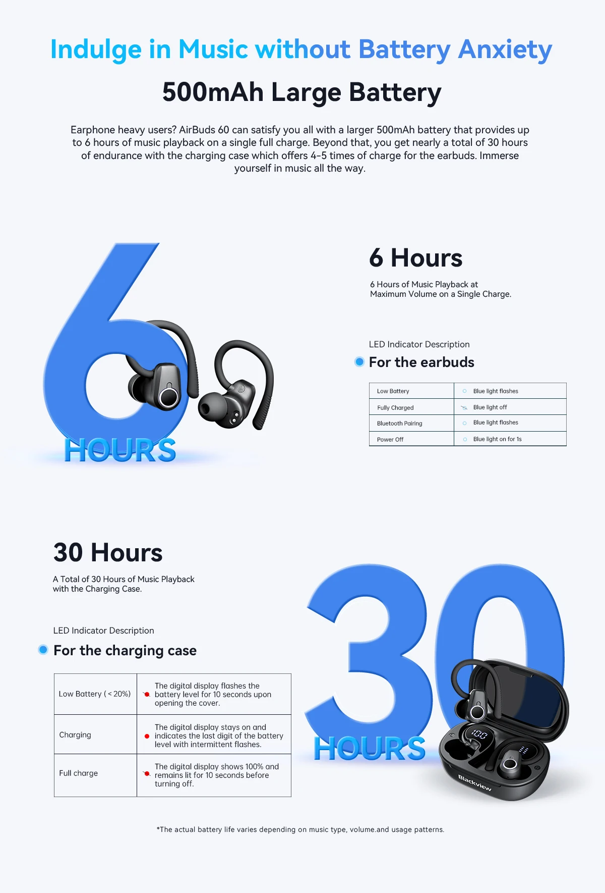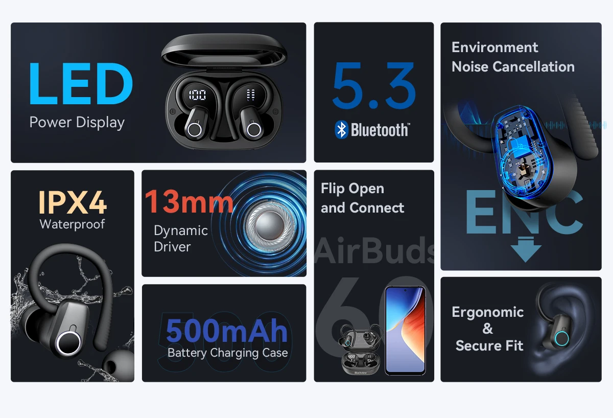 Blackview Bluetooth 5.3 Wireless Earbuds with Mic IPX7 Waterproof 200H Earphones with Hooks for Sports Running Workout Gym
