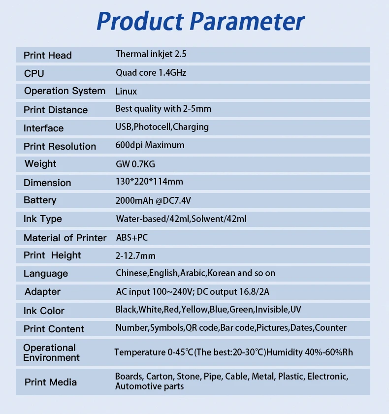 Print Content: Number,Symbols,QR code,Bar code,Pictures,Dates,Counter,Time, Date, Counter, QR code, Barcode, Logo, Batch Number, etc.