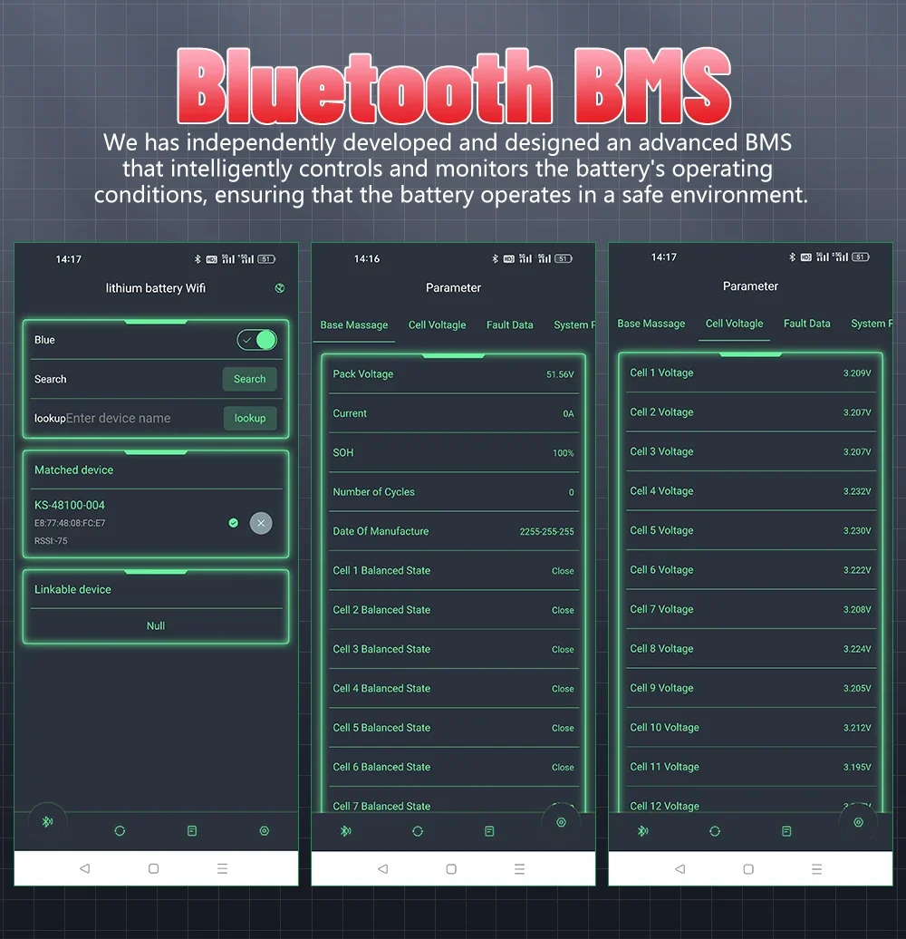 Mobile app, Bluetooth connection. Remote mobile phone monitoring of real-time battery data.